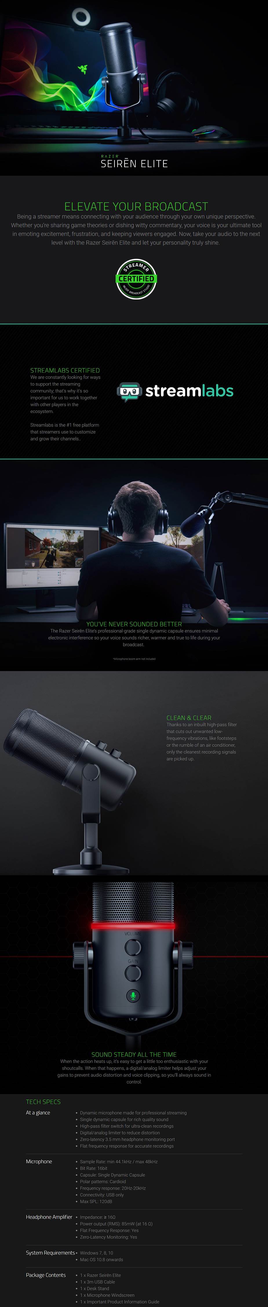 Razer Seiren Elite Professional Grade Dynamic Streaming Microphone - Sample Rate: min 44.1kHz / max 48kHz - Bit Rate: 16bit - Capsule: Single Dynamic Capsule - Polar patterns: Cardioid - Frequency response: 20Hz-20kHz - Connectivity: USB only - Max SPL: 120dB - High-pass filter switch for ultra-clean recordings - RZ19-02280100-R3M1 - 12 Months Limited Warranty