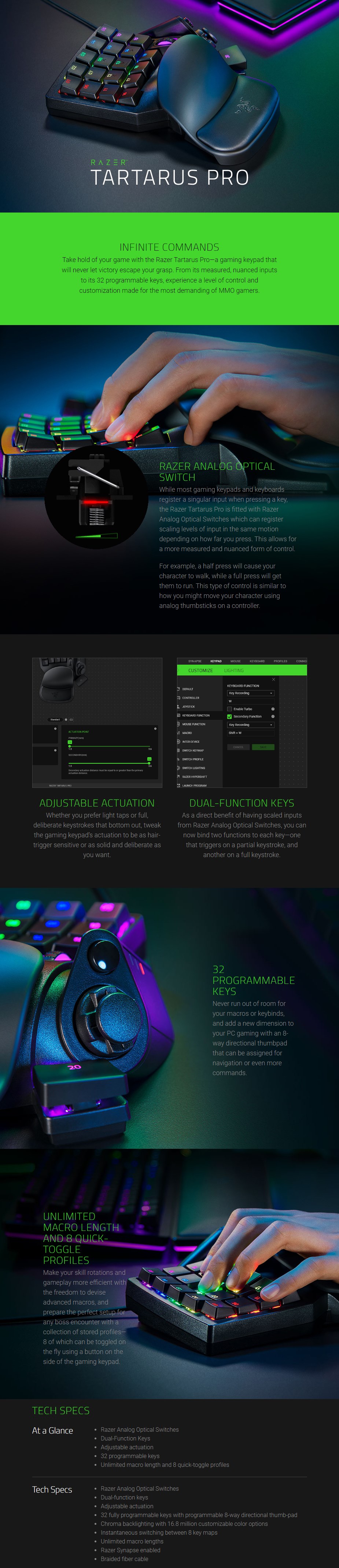 Razer Tartarus Pro Chroma Optical Gaming Keypad - Black - Razer Analog Optical Switches - Dual-Function Keys - Adjustable actuation - 32 programmable keys - Unlimited macro length and 8 quick-toggle profiles - RZ07-03110100-R3M1 - 2 Years Limited Warranty