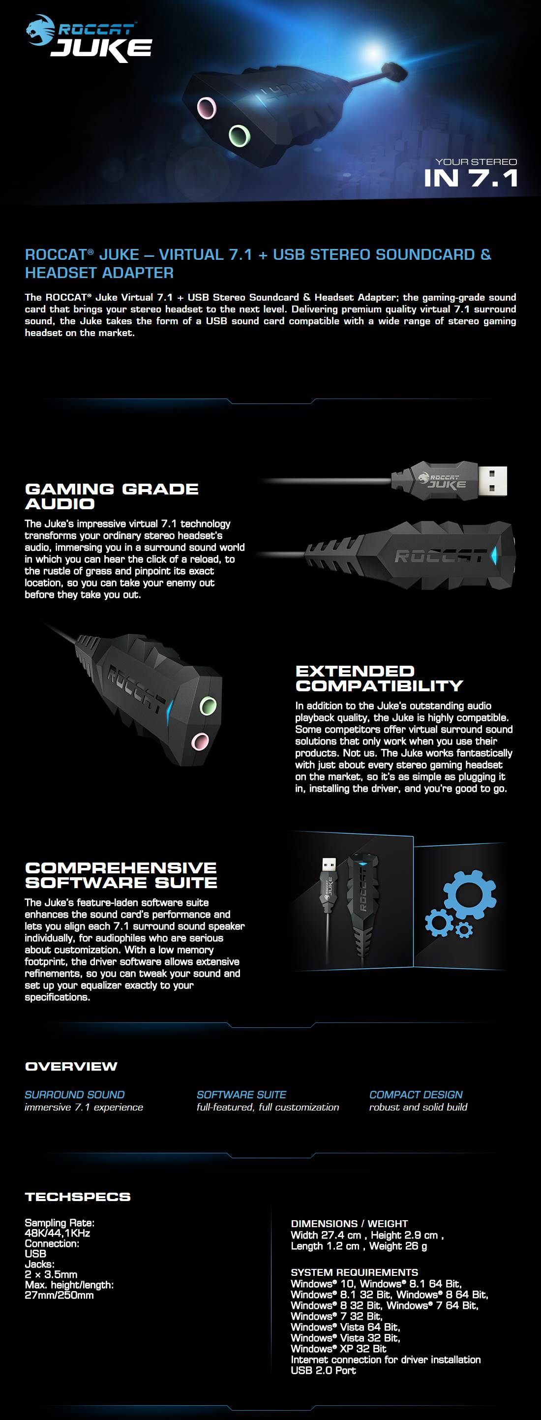 ROCCAT® JUKE - VIRTUAL 7.1 + USB STEREO SOUNDCARD & HEADSET ADAPTER The ROCCAT® Juke Virtual 7.1 + USB Stereo Soundcard & Headset Adapter; the gaming-grade sound card that brings your stereo headset to the next level. Delivering premium quality virtual 7.1 surround sound, the Juke takes the form of a USB sound card compatible with a wide range of stereo gaming headset on the market. GAMING GRADE AUDIO The Juke's impressive virtual 7.1 technology transforms your ordinary stereo headset's audio, immersing you in a surround sound world in which you can hear the click of a reload, to the rustle of grass and pinpoint its exact location, so you can take your enemy out before they take you out. EXTENDED COMPATIBILITY In addition to the Juke's outstanding audio playback quality, the Juke is highly compatible. Some competitors offer virtual surround sound solutions that only work when you use their products. Not us. The Juke works fantastically with just about every stereo gaming headset on the market, so it's as simple as plugging it in, installing the driver, and you're good to go. COMPREHENSIVE SOFTWARE SUITE The Juke's feature-laden software suite enhances the sound card's performance and lets you align each 7.1 surround sound speaker individually, for audiophiles who are serious about customisation. With a low memory footprint, the driver software allows extensive refinements, so you can tweak your sound and set up your equaliser exactly to your specifications.