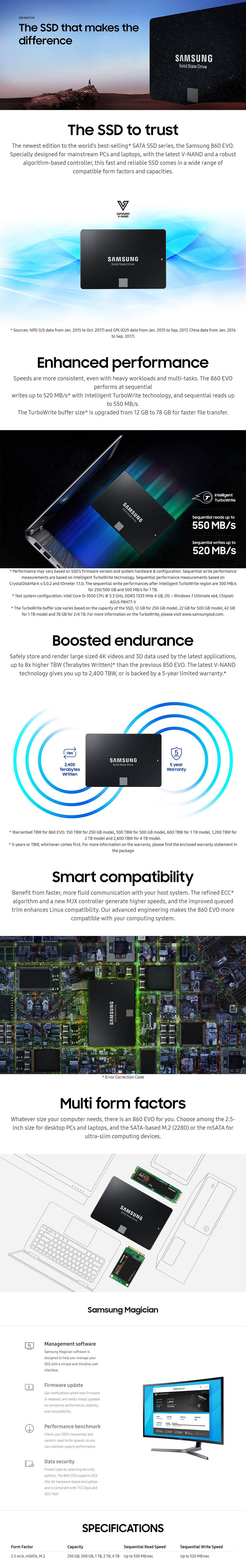 The Samsung 860 Evo 250GB SATA M.2 SSD (MZ-N6E250BW) is designed as a replacement drive for mainstream desktops and laptops. It is an updated version of the popular 850 Evo, offering improved performance, reliability, and capacity over its predecessor. The 860 Evo is equipped with Samsung’s latest MJX controller and fourth generation V-NAND technology to provide industry-leading performance for a SATA SSD drive. Enhanced performance By using Samsung’s fourth generation V-NAND and intelligent TurboWrite technology, the 860 Evo delivers high-speed sequential read speeds up to 550 MB/s and write speeds up to 520 MB/s. The latest version of TurboWrite automatically allocates 6x more space on the drive as previous versions which should help to avoid periodic write performance issues during the transfer of large files. Unmatched reliability The Samsung 860 Evo 250GB SATA M.2 SSD assures improved reliability over the previous 850 Evo generation thanks to improved V-NAND technology which was proven with a comprehensive heavy load user testing environment. This allows Samsung to offer an unmatched 5-year limited 1,200 TBW warranty on all 860 series drives. Long-term performance degradation of the drive has also been reduced, with the drive providing up to 51% higher sustained performance compared to its predecessor. Advanced security features With a range of advanced data encryption technologies built-in, the 860 Evo range helps to keep your private data safe from prying eyes. The drive includes AES 256 bit hardware-based encryption, which helps to protect data without the performance degradation that is often seen with conventional software encryption technology. The 860 Evo is also compliant with TCG Opal and IEEE 1667 encryption standards, giving you peace of mind that your data is stored using the safest most secure protocols. Easy installation and management Because the 860 Evo 250GB SATA M.2 SSD is designed as a replacement drive it comes with Samsung's data migration software as standard. This easy to use powerful software allows you to quickly clone your old drive making data migration an effortless process. And once your data is transferred the software helps to keep your drive optimised for performance by checking for updates and firmware upgrades automatically.