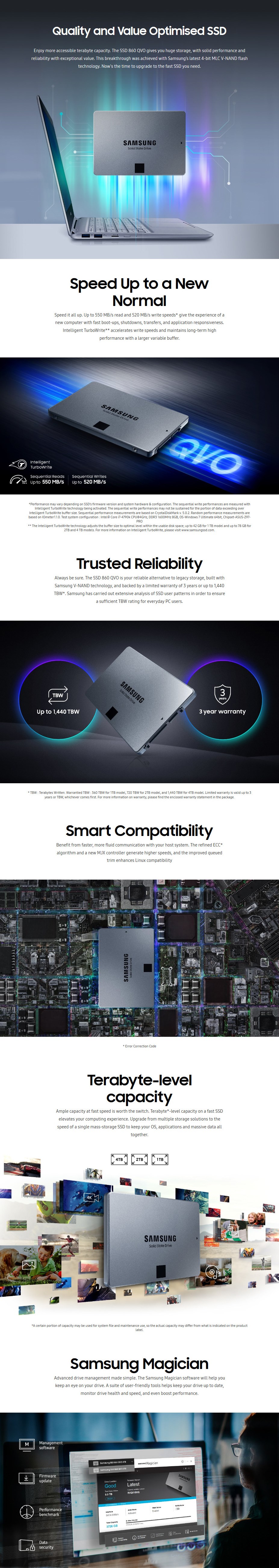 Samsung 860 QVO 1TB 2.5" SATA III 6GB/s V-NAND SSD MZ-76Q1T0BW - Capacity: 1TB - Form Factor: 2.5" - SATA 6 Gb/s Interface - Samsung MJX Controller - Sequential Read (Max): 550MB/s - Sequential Write (Max): 520MB/s - Samsung V-NAND 4bit MLC - Cache Memory: Samsung 1 GB Low Power DDR4 SDRAM - 96K/89K IOPS (QD32) - MTBF: 1,500,000 Hours - 3 Years Limited Warranty