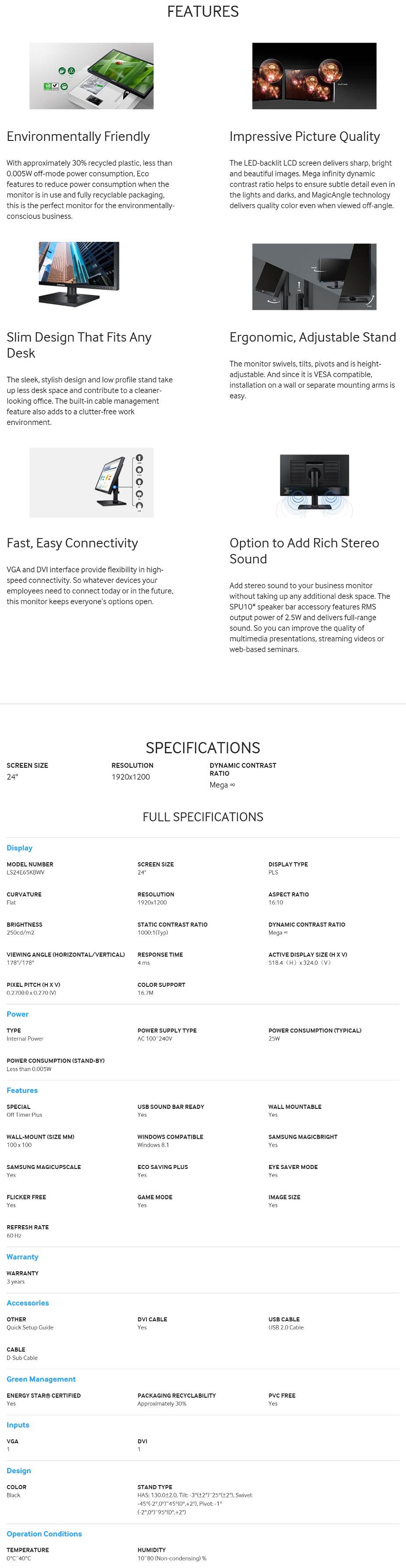 Product Name Samsung LS24E65KBWV/XY 24" WUXGA PLS LED Monitor