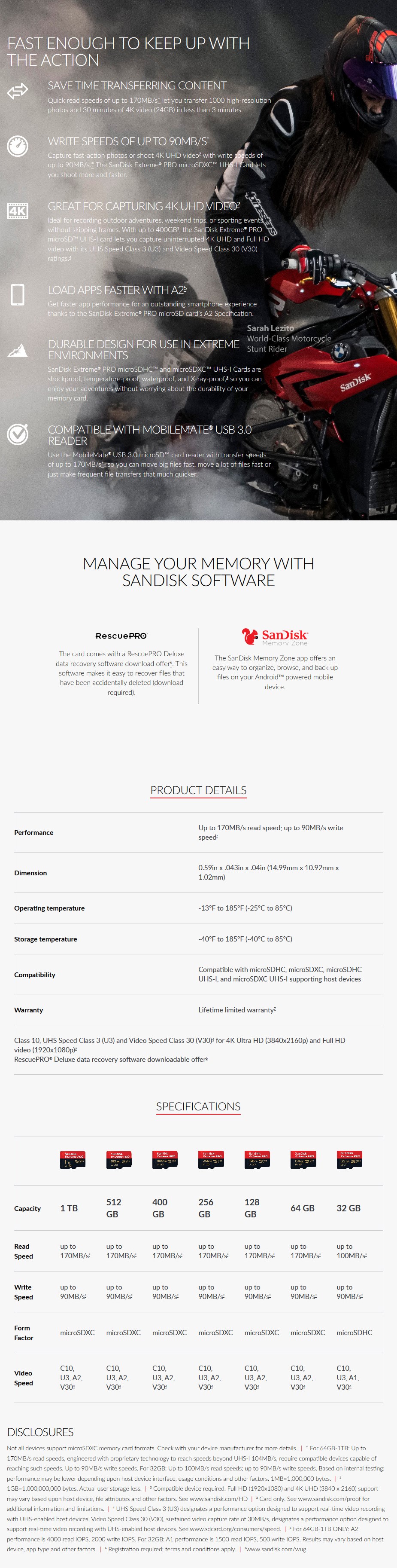 SanDisk 128GB Extreme PRO microSDXC UHS-I U3 A2 V30 C10 Memory Card - 170MB/s - Read speeds of up to 170MB/s, Write speeds of up to 90MB/s - Video Speeds: C10, U3, A2, V30 - Form Factor: microSDXC - Includes SD Adapter - Compatible with: microSDHC, microSDXC, microSDHC UHS-I and microSDXC UHS-I supporting Host Devices - SDSQXCY-128G - Limited Product Lifetime Warranty