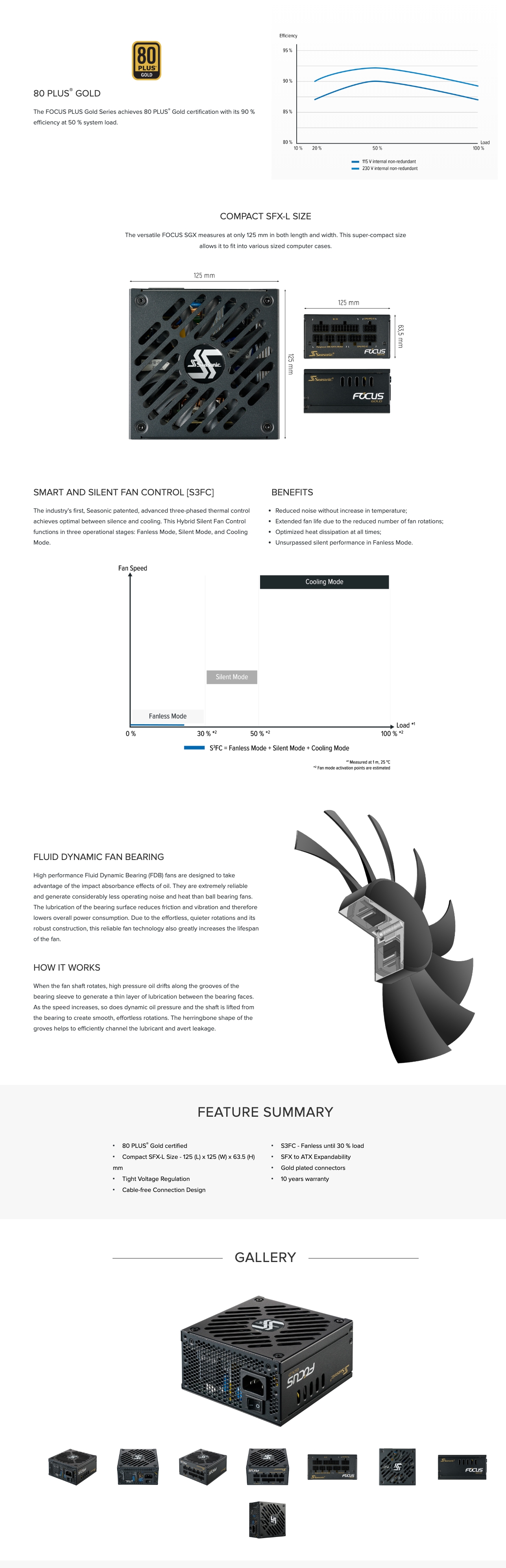 OVERVIEWThe long-awaited new line of Seasonic's FOCUS SGX is versatile in its application, and powerful with a small footprint. The FOCUS SGX is shipped with an SFX to ATX adapter bracket in the box, which allows the power supply to be mounted not only in the SFX form factor chassis, but also a standard ATX chassis should the user prefers to reserve more space for airflow inside the PC case. The Seasonic hybrid fan control is always enabled to optimize the cooling according to necessity. SPECIFICATIONS