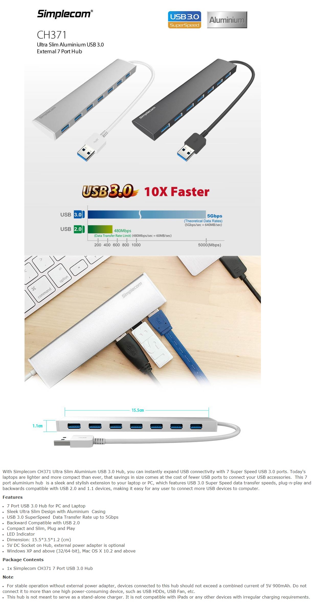 Simplecom CH371-BK Ultra Slim 7-Port USB 3.0 Hub - Black - CH371-BK - 7 Port USB 3.0 Hub - Sleek Ultra Slim Design with Aluminium Casing - up to 5Gbps - Backward Compatible with USB 2.0 - Compact and Slim, Plug and Play - LED Indicator - 15.5*3.5*1.2 (cm) - 5V DC Socket on Hub, external power adapter is optional - Windows XP and above (32/64-bit), Mac OS X 10.2 and above - 12 Months Limited Warranty