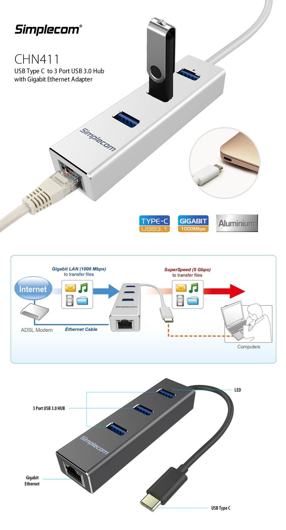 Product Name | Simplecom CHN411-BK Aluminium Usb Type C To 3 Port Usb 3.0 Hub With Gigabit Ethernet Adapter Black |