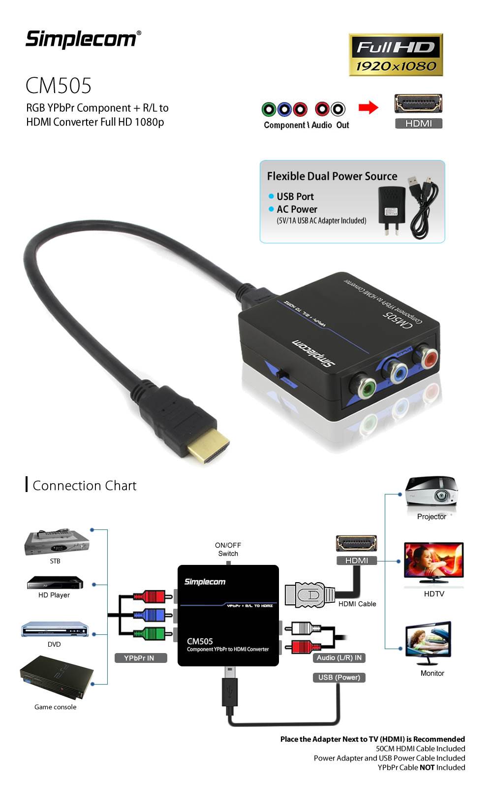 Description Simplecom CM505 RGB (YPbPr) Component to HDMI converter allows older analog devices to be integrated seamlessly into the modern home theatre. This adapter connects component video home theatre devices to HDMI compliant digital monitors. It also takes digital audio and encodes it onto the HDMI signal for the full HDMI video and audio effect. With the Component+ Digital Audio to HDMI Adapter legacy home theatre devices can be easily connected any HDMI display for the full digital video and audio experience. Feature