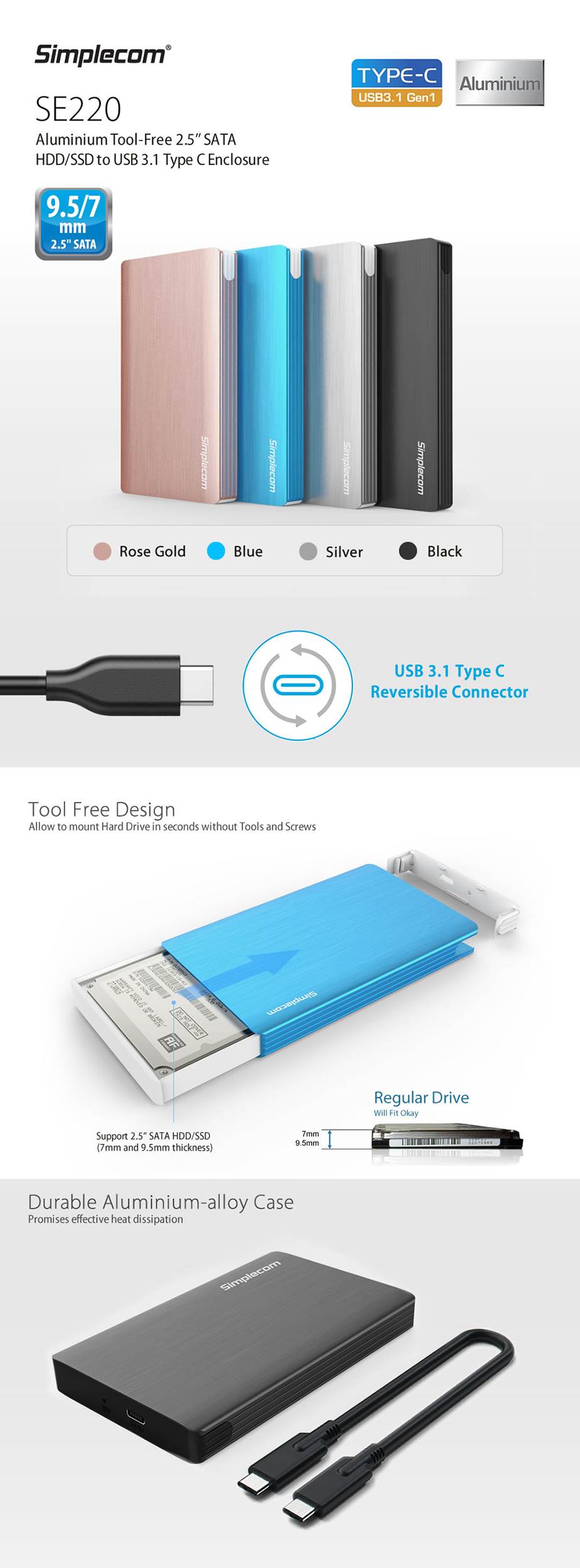 Simplecom SE220 Aluminium Tool-Free 2.5'' SATA HDD/SSD to USB 3.1 Type C Enclosure Use your HDD or SSD in style with the SE220 Type-C Aluminium Enclosure. Next Generation USB Type-C reversible connector and transfer speeds up to 5Gbps via USB 3.1 Gen1, you can access your data faster and easier. With a solid aluminium casing, the SE220 looks elegant and professional on any desk, also the Tool-Free design allow to mount Hard Drives in seconds without Tools and Mounting Screws , allow to accessing multiple 2.5" SATA Drives easily. Available in four colors, you can match the Type-C Enclosure to your favourite desk accessories, or match your computer. Choose from Black, Silver, Blue and Rose Gold.