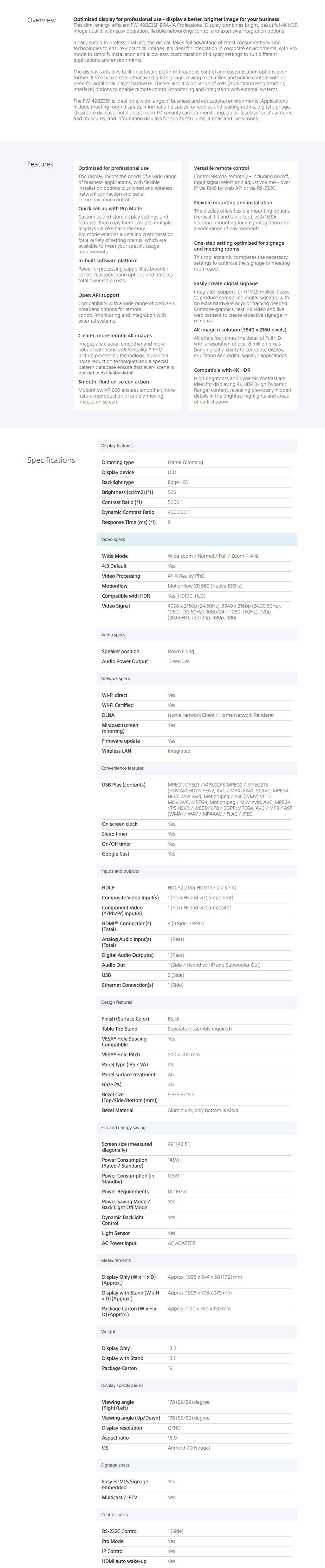 Sony Bravia BZ35F 49" 4K UHD 24/7 HDR LED Professional Display - Frame Dimming - Edge LED - LCD Display Device - 4K X-Reality PRO - Motionflow XR 960 (Native 100Hz) - HDCP2.2, 1x Component, 1x Composite, 4x HDMI, 1x Digital Audio, 1x Audio, 3x USB, 1x Ethernet - 16:9 Native Aspect Ratio - Wireless - VESA - 3 Years Limited Warranty