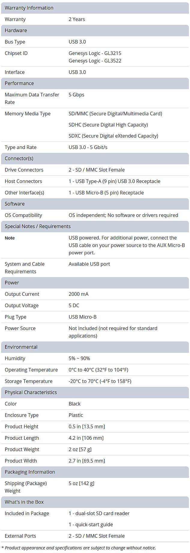 Product Name StarTech 2-Slot USB 3.0 SD Card Reader