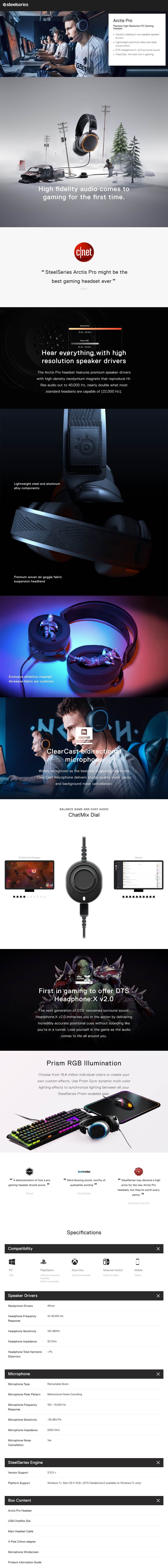 SteelSeries Arctis Pro Headset - Black - Over-Ear - 40mm Neodymium Drivers - 10-40000 Hz - Connectivity Included: Main headset cable, USB ChatMix Dial & 4-Pole 3.5mm adapter - Bidirectional Noise-Canceling Retractable Microphone - DTS Headphone:X v2.0 surround sound - Prism RGB Illumination - 61486 - 12 Months Limited Warranty