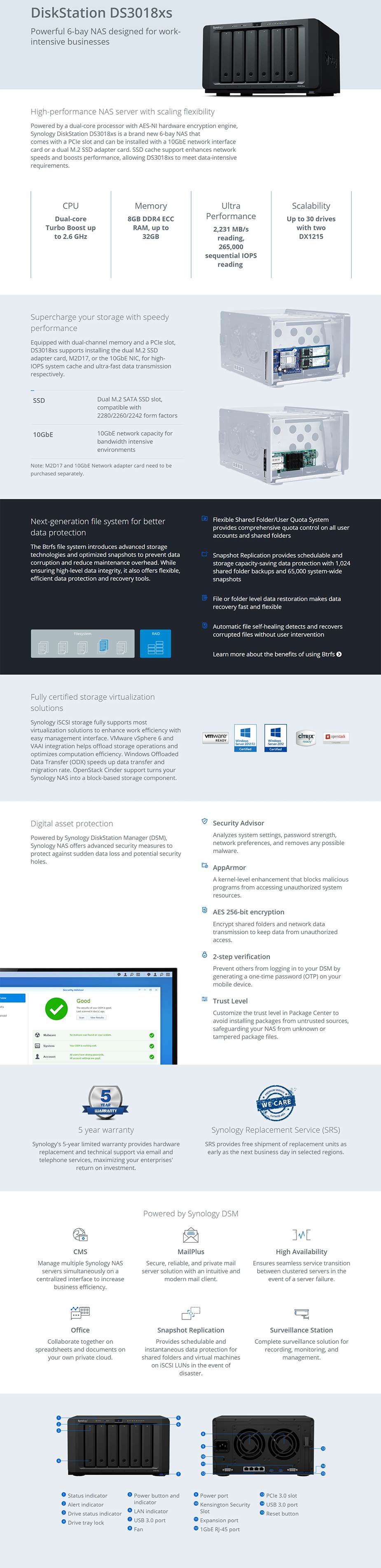 Product Name | Synology DiskStation DS3018xs 6 Bay Diskless NAS Dual Core CPU 8GB RAM |