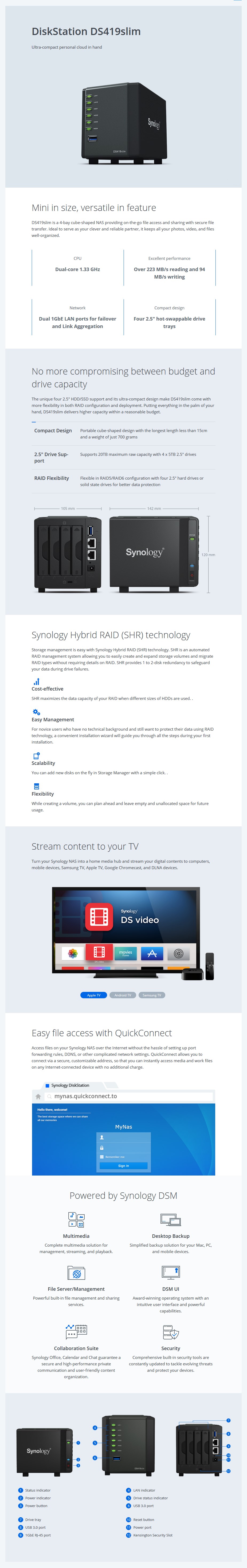 Synology DiskStation DS419slim 4-Bay Diskless NAS - Processor: Marvell Armada 385 88F6820, Dual-Core 1.33 GHz - Memory: 512MB DDR3L - Drives Supported: 4x Hot-Swappable 2.5" SATA HDD/SSDs - 2x RJ-45 1GbE LAN Ports - 2x USB 3.0 -Up to 223 MB/s Read & 94 MB/s Write - Small Form Factor - Flexible RAID5/RAID6 Configuration - Supports Max 20TB (4x 5TB 2.5" Drives) - Synology Hybrid RAID Technology - 3 Years Limited Warranty