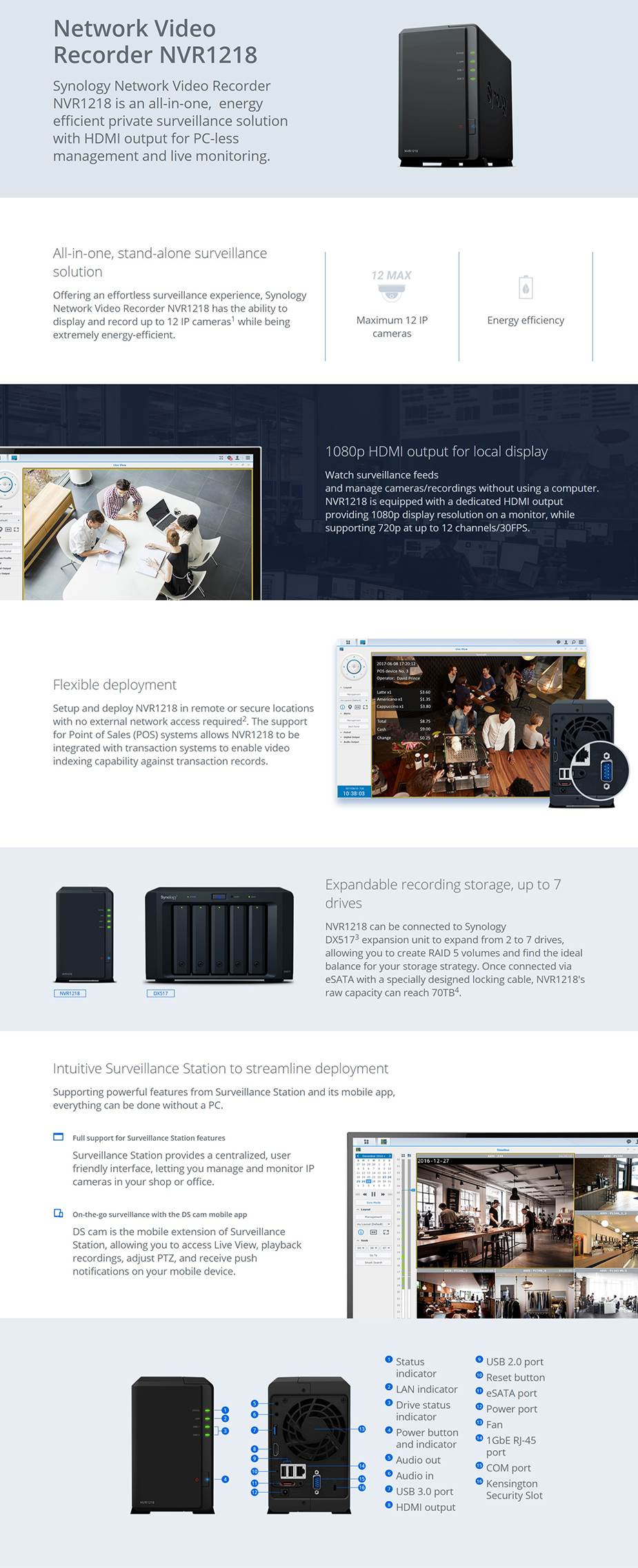 Synology NVR1218 2 Bay Network Video Recorder - Embedded NVR SoC Dual Core 1.0GHz 32-bit - 2x Drive Bays - 7x Maximum Drive Bays with Expansion Unit - Compatible Drive Type: 3.5" SATA HDD - Maximum Internal Raw Capacity: 20TB (2x 10TB drives), Maximum Raw Capacity with Expansion Units: 70TB (7x 10TB drives), Capacity may vary by RAID types - 2x USB 2.0, 1x USB 3.0, 1x eSATA, 1x COM, 1x HDMI, 1x 3.5mm Stereo Audio Jack (in/out) ports - 1x 80mm System Fan - NVR1218 - 3 Years Limited Warranty