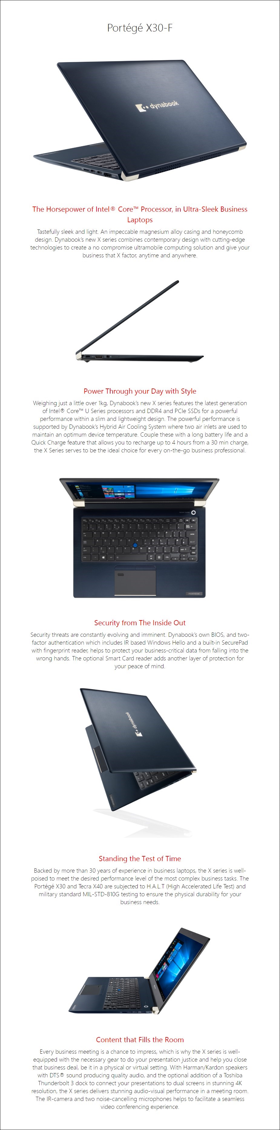 Toshiba dynabook Portege X30-F Notebook/Laptop - CPU: Intel Core i7-8565U Processor (1.8GHz Base, Up to 4.6GHz) - Display: 13.3" Full HD Widescreen (1920 x 1080) Touchscreen - Graphics: Integrated - Memory: 8GB DDR4 2400MHz RAM - Storage: 256GB PCIe SSD - Network: Intel 802.11ac/a/g/n + Bluetooth 4.0 - Harman Kardon Speakers - Colour: Blue Black - Backlight Keyboard - PUR31A-0XM002 - 3 Years Limited Warranty