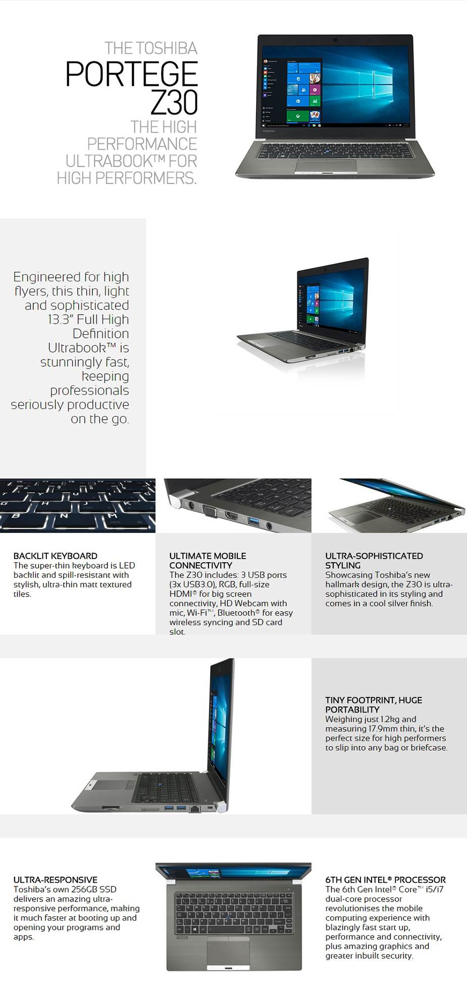 Product Name | Toshiba Portege Z30 PT263A-16N00T 13.3" FHD Notebook i5-6200U 8GB 256GB SSD W10P |