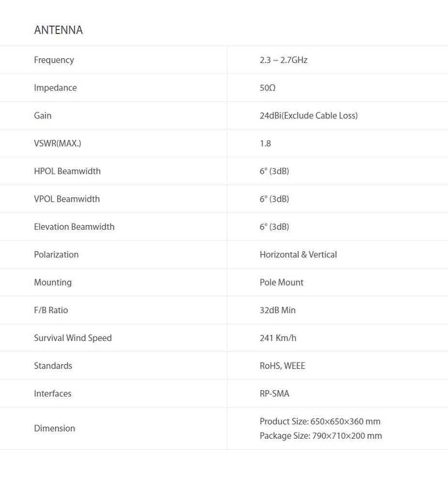 Gain | 24dBi(Exclude Cable Loss) |