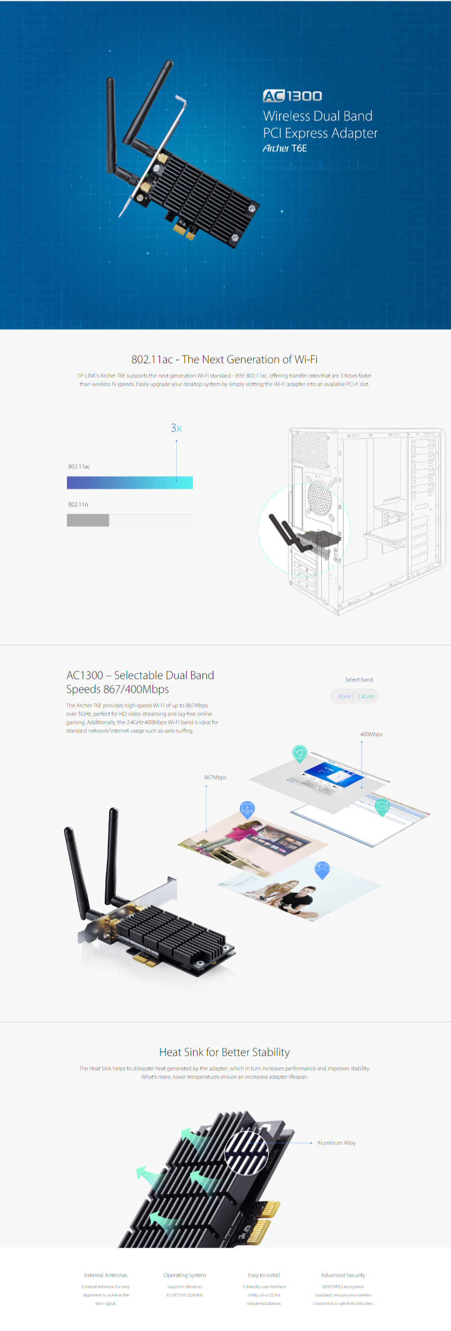• Easy Installation – Upgrade your desktop system easily by plugging the Archer T6E Wi-Fi adapter into an available PCI-E slot