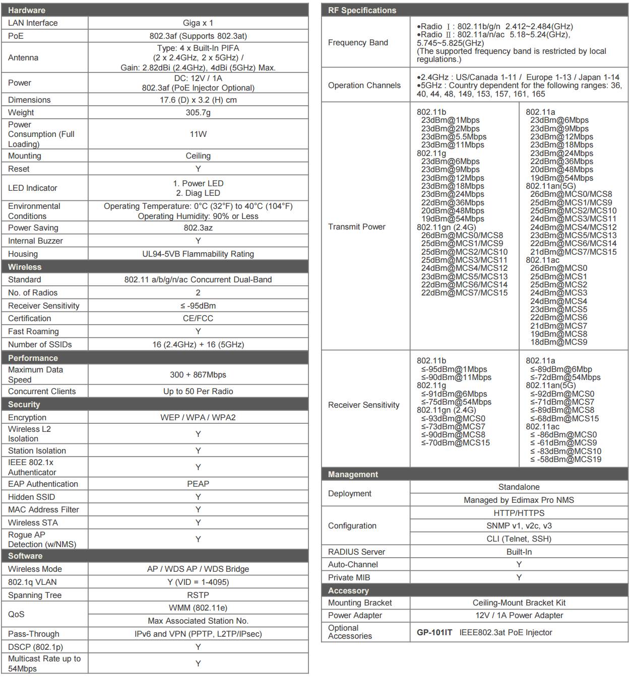 High Performance Design with High-Speed 1200Mbps Dual-Band 11ac State-of-the-art IEEE 802.11ac wireless technology delivers the Giga-fast Wi-Fi speeds that today’s fast-moving modern business environments demand. And simultaneous 2.4GHz & 5GHz dual-band coverage means maximum flexibility for mobile-centric business productivity applications. Speeds up to 300Mbps on the 2.4GHz band and 867Mbps on the 5GHz band can handle even the most bandwidth intensive tasks, perfect for audio, video and voice applications and significantly faster than traditional 802.11n Wi-Fi. Additionally Edimax Pro series products feature other high-performance design features such as solid capacitors for significantly longer lifespans than traditional non-solid alternatives, generating less heat and delivering increased stability. Durable, robust and ready for business environments.? ?Wide Coverage & Multiple SSIDs With adjustable RF output power and high receiver sensitivity, Edimax Pro access points are equipped to provide wide coverage where it’s needed the most. Suitable for large spaces across office floors, shop floors, hospital wards, or conference rooms, get the wireless coverage that staff and systems need to operate efficiently. Keep every corner of your business connected and differentiate user groups, departments or guests with up to 32 separate SSIDs with independent security. Wide, accessible Wi-Fi coverage with strong security to protect sensitive company information and supervise access to internal networks. BYOD Solutions & High Density Networking Bring Your Own Device (BYOD) is becoming an increasingly commonplace company trend in offices and enterprise environments worldwide. Employees are using their own smartphones, tablets and laptops with the latest cloud-connected productivity apps to get things done, and traditional 2.4GHz is crowded, so most of these devices need or support high-speed 5GHz Wi-Fi. And in offices, hotels, schools or other densely populated environments, access points need to cope with a high volume of users connecting to the network at any time, whether it’s customers or employees. Edimax Pro solutions support the latest 802.11ac 2.4GHz & 5GHz dual-band Wi-Fi along with high-density capacity to support up to a hundred users simultaneously, ideal for BYOD workplaces and a large number of wireless devices. Seamless Mobility Typical wireless access points can effectively cover a 25m – 30m radius under normal usage. Now with the technological advances in Edimax Pro access points, we can extend effective coverage approximately 1.5x further, eliminating Wi-Fi dead zones completely and providing blanket coverage across enterprise environments. Wireless devices can stay seamlessly connected in environments where connectivity may be a critical component of efficiency and productivity, and benefit from mobility with high-speed connectivity across a range of wireless devices: smartphones, tablets and computers, throughout an entire organization. Hotels, Offices, Schools and Hospitals Edimax Pro series access points, with high-speed 11ac high-density networking for up to 100 simultaneous users, are ideal for multi-tenant unit buildings, hotels, resorts, hospitals, campuses, conventions or anywhere with large-scale network use, with safety and effectiveness guaranteed. Rogue AP Detection & Wireless Isolation Rogue access point detection can identify any unauthorized SSIDs which may have been installed in an otherwise secure network with malicious intent, and L2 wireless isolation provides wireless security. Easy and Intuitive Central Network Management Suite (NMS) Edimax Pro NMS (Network Management Suite) is a web-based wireless network management system. Company MIS departments can plan and manage Edimax Pro access points’ powerful functionality according to their office space using an easy, remote web-based interface which includes a dashboard, map view, traffic statistics and wireless client list for network-wide remote administration. RADIUS settings, WLAN group settings, access control, guest network settings and firmware upgrades can all be managed centrally from a single location to reduce network downtime, aid troubleshooting and optimize network performance. Zone plans and setup wizards are also available for expanding and managing large networks with multiple access points. AP Array Edimax Pro Network Management Suite (NMS) supports AP array architecture, which enables the central management of a group of access points. NMS can be installed on one access point and support up to 8 Edimax Pro access points with no additional wireless controller required, reducing costs and facilitating efficient remote AP management. Access points can be deployed and configured according to requirements, creating a network powerful network architecture which can be easily managed and expanded in the future, with an easy to use interface and a full range of functionality for company MISs. Easy Installation Kit Ceiling-mount & T-rail mount design with easy installation kit. Specifications |