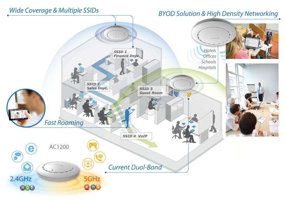 Bring Your Own Device (BYOD) is becoming an increasingly commonplace company trend in offices and enterprise environments worldwide. Employees are using their own smartphones, tablets and laptops with the latest cloud-connected productivity apps to get things done, and traditional 2.4GHz is crowded, so most of these devices need or support high-speed 5GHz Wi-Fi. And in offices, hotels, schools or other densely populated environments, access points need to cope with a high volume of users connecting to the network at any time, whether it’s customers or employees. Edimax Pro solutions support the latest 802.11ac 2.4GHz & 5GHz dual-band Wi-Fi along with high-density capacity to support up to a hundred users simultaneously, ideal for BYOD workplaces and a large number of wireless devices.