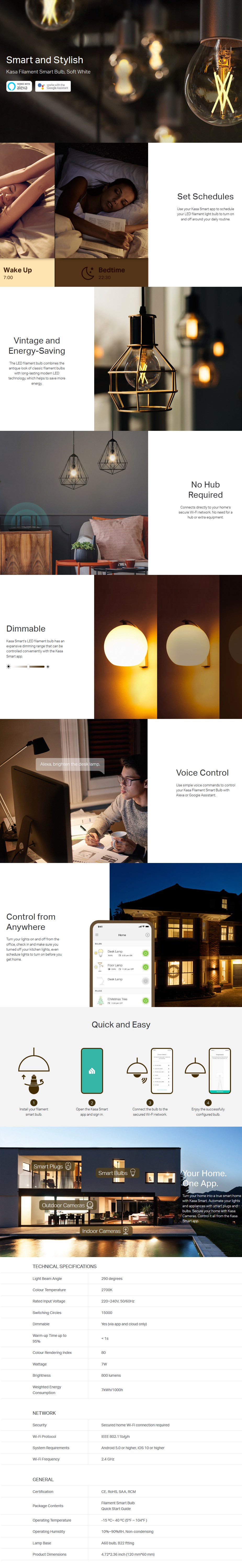 TP-Link KL50B Kasa Filament Smart Wi-Fi LED Bulb with Soft White Light - Bayonet - Brightness: 800 Lumens - Color Temperature: 2700K - Light Beam Angle: 290° - Lamp Base: A60 Bulb, B22 Fitting - Wi-Fi Protocol: IEEE 802.11b/g/n - Wireless Frequency: 2.4GHz - Rated Input Voltage: 220~240V, 50/60Hz - Wattage: 7W - Dimmable via Kasa Smart App and Cloud - 2 Years Limited Warranty |