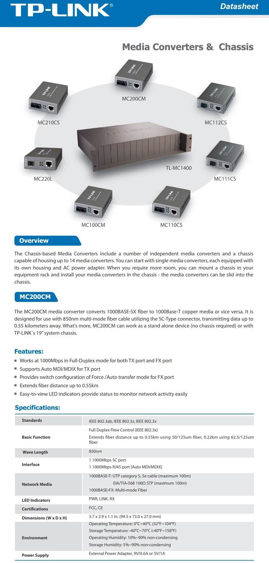 Tp-link Mc200cm Gigabit Multi-mode Media Converter Extends Fiber Distance Up To 0.55km Complies With Ieee 802.3ab And Ieee 802.3z