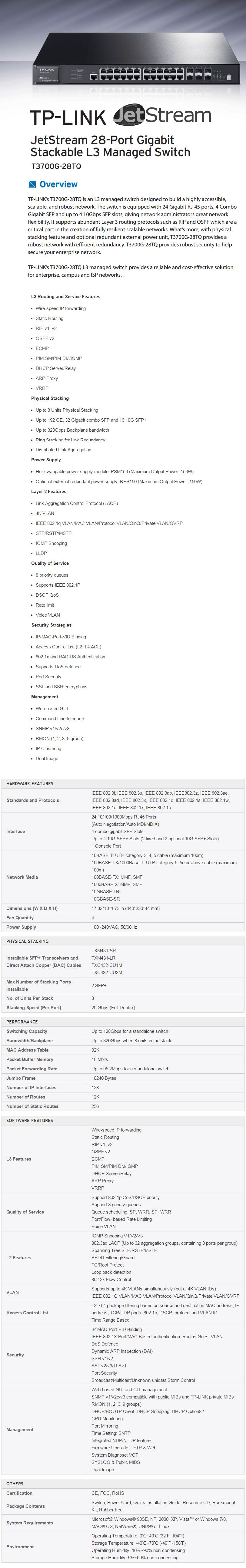 10G Stackable L3 Switch - JetStream 28- Port Gigabit Stackable L3 Managed Switch TP-Link`s T3700G-28TQ is an L3 managed switch that features L3 routing, 10 Gbps wired-speed, physical stakcing and optional redundant external power unit, designed to meet the needs of the convergence layer. The switch is equippped with 24 Gigabit RJ-45 ports + 4 combo Gigabit SFP and up to 4 10Gbps SFP+ slots, integrated with robust security and abundant management features, TP-Link`s T3700G-28TQ L3 managed switch provides a reliable and cost-effective solution for enterprise,campus and ISP networks.