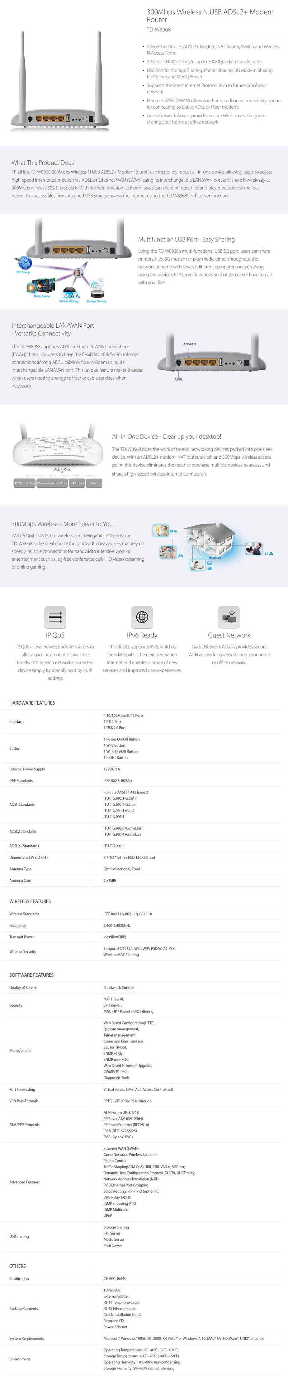 Product Name | TP-LINK TD-W8968 Wireless N300 ADSL2+ Modem Router With USB Port - NBN Ready |