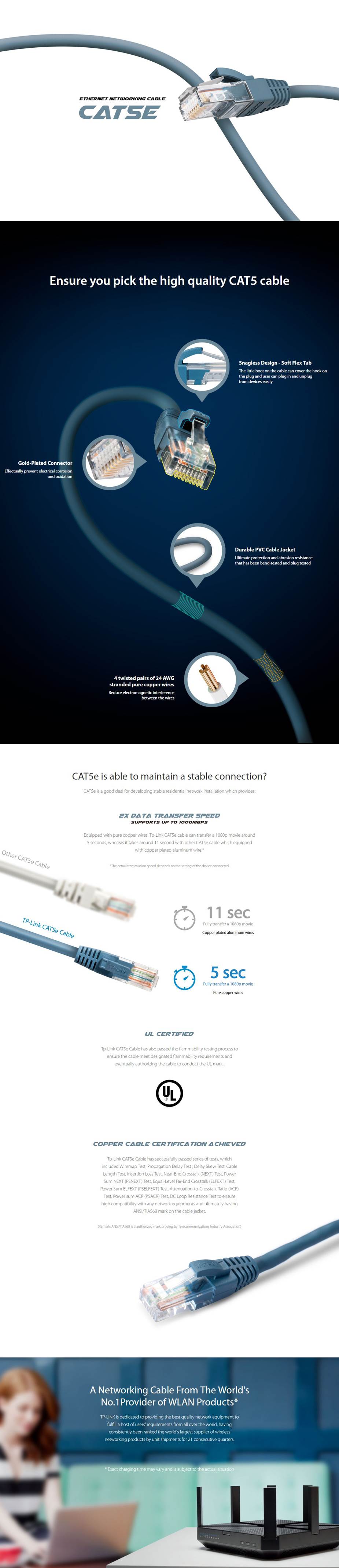 Equipped with pure copper wires, Tp-Link CAT5e cable can transfer a 1080p movie around 5 seconds, whereas it takes around 11 second with other CAT5e cable which equipped with copper plated aluminum wire.*