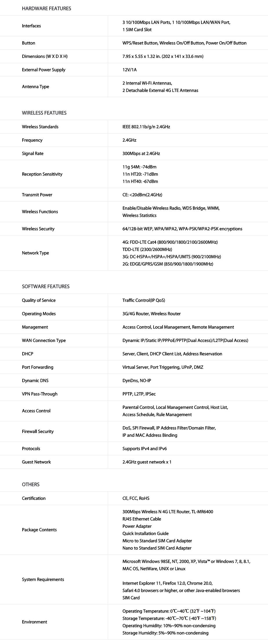 Product Name | TP-Link TL-MR6400 300Mbps Wireless N 4G LTE Router | ||||||||||