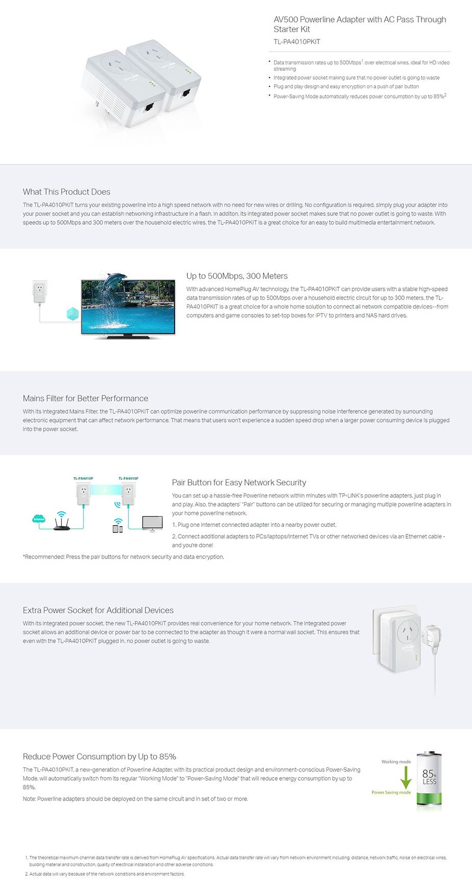 TP-Link TL-PA4010PKIT AV500 Powerline Adapter with AC Pass Through Starter Kit 500Mbps HomePlug AV 1x100Mbps LAN Power Socket 300m range Plug and play Data transmission rates up to 500Mbps1 over electrical wires, ideal for HD video streaming Integrated power socket making sure that no power outlet is going to waste Plug and play design and easy encryption on a push of pair button Power-Saving Mode automatically reduces power consumption by up to 85%2 HARDWARE FEATURES Plug Type EU, UK, FR Standards and Protocols HomePlug AV, IEEE802.3, IEEE802.3u Interface 1* 10/100Mbps Ethernet Port, Power Socket Button Pair Button Power Consumption Maximum: 5.00W (220V/50Hz) Typical: 4.60W (220V/50Hz) Standby: 0.72W (220V/50Hz) LED Power, Powerline, Ethernet Dimensions ( W x D x H ) 3.7 x 2.3 x 1.7 in. (95 x 58 x 42 mm) Range 300 meters in house SOFTWARE FEATURES Modulation Technology OFDM Encryption 128-bit AES Encryption OTHERS Certification CE, FCC, RoHS Package Contents Powerline Ethernet Adapter *2 Ethernet cable (RJ45) *2 Resource CD Quick Installation Guide System Requirements Windows 8/7/Vista/XP/2000, Mac OS, Linux* Environment Operating Temperature: 0°C~40°C (32°F~104°F) Storage Temperature: -40°C~70°C (-40°F~158°F) Operating Humidity: 10%~90% non-condensing Storage Humidity: 5%~90% non-condensing