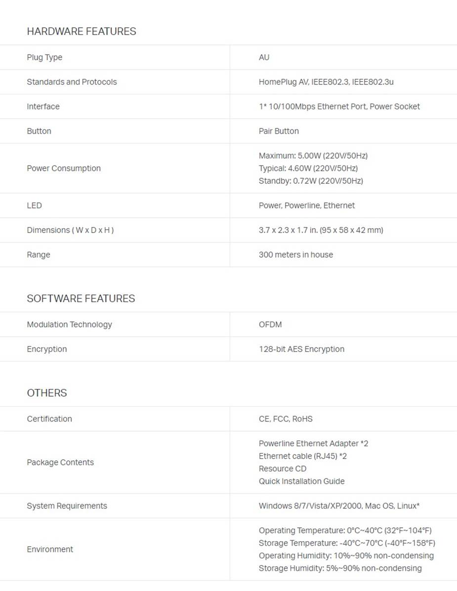 Advanced Features HomePlug AV standard compliant, high-speed data transfer rate of up to 500Mbps, ideal for HD video streaming and online gaming