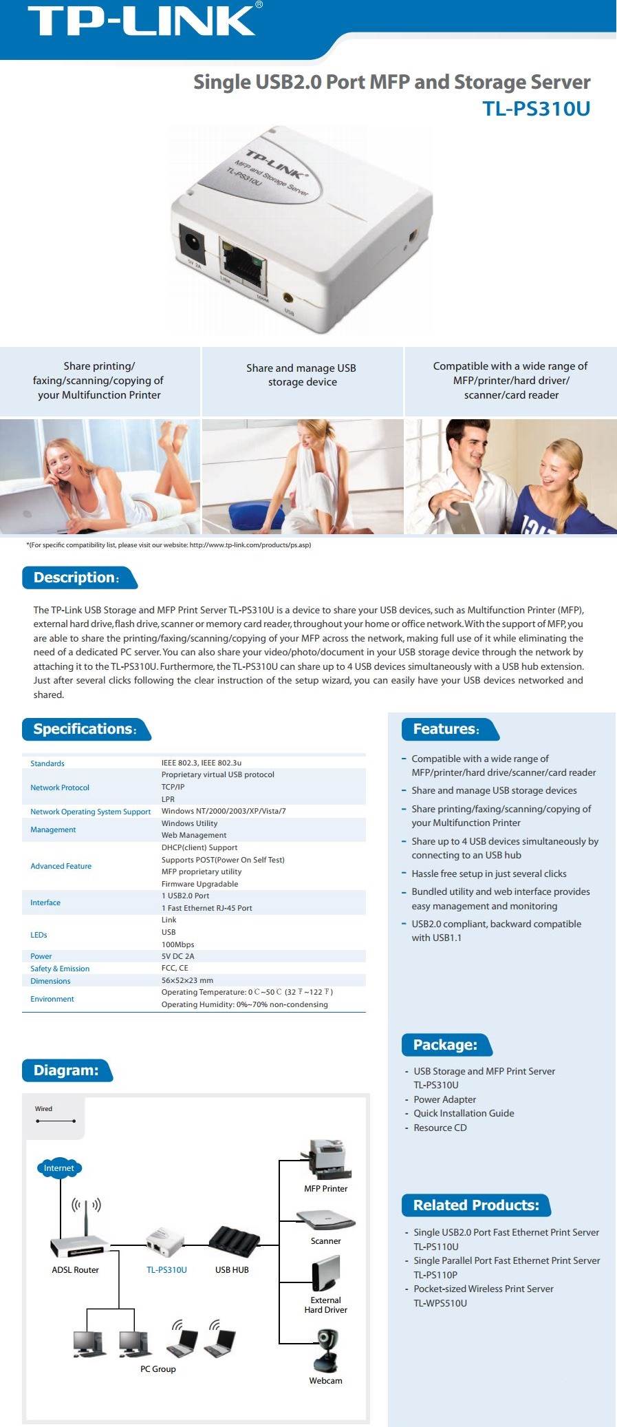 TP-LINK TL-PS310U MFP Print and Storage Server The TP-LNK MFP and Storage Server TL-PS310U is ideal for sharing USB connected devices across a home or office network. The device is compatible with the majority of printers and multi-function printers on the market and allows for seamless sharing and management of those devices with network connected computers. The device is also capable of operating with up to four USB based devices such as scanners, flash drives, speakers, and webcams with a USB dock connected to the server. These devices may be accessed from across the network and even wirelessly when the Server is connected to a wireless router. |