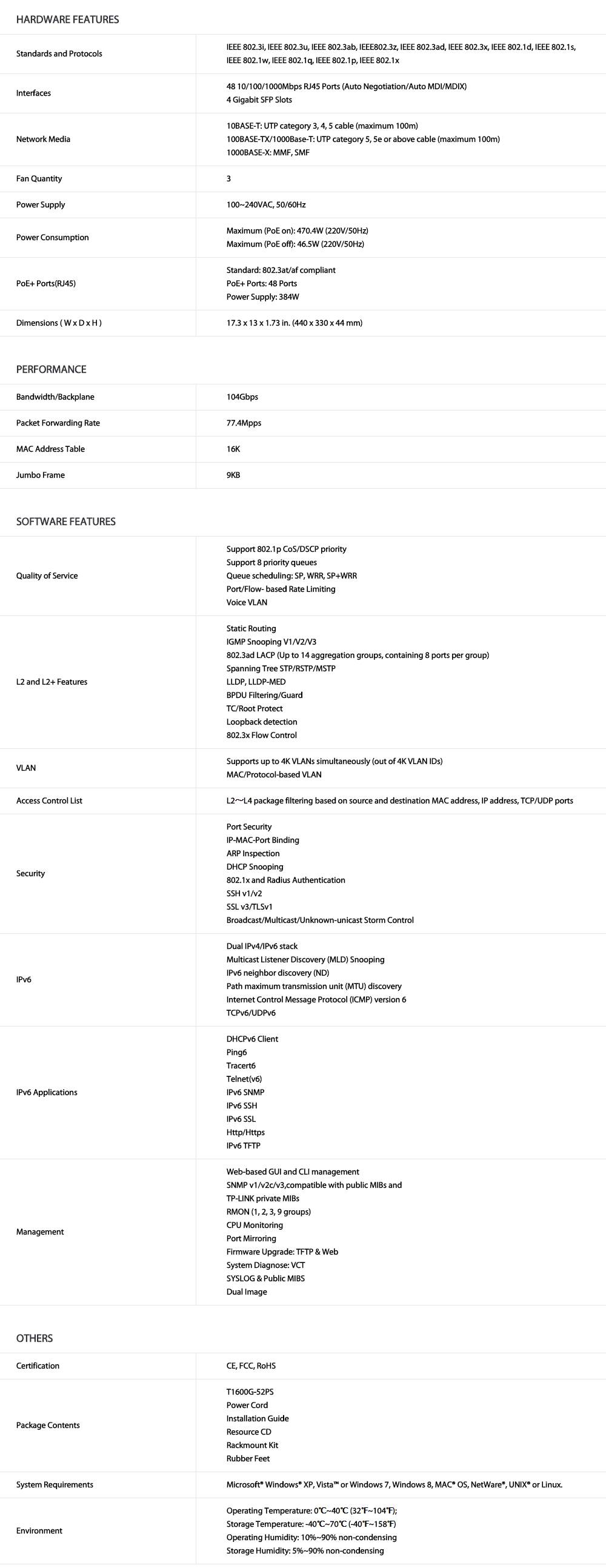 JetStream 48-Port Gigabit Smart PoE+ Switch with 4 SFP Slots Supports 48 802.3at/af-compliant PoE+ ports with a total power supply of 384W L2+ Feature——Static Routing, helps route internal traffic for more efficient use of network resources IP-MAC-Port Binding, ACL, Port Security, DoS Defend, Storm control, DHCP Snooping, 802.1X and Radius Authentication provide you robust security strategies L2/L3/L4 QoS and IGMP snooping optimize voice and video applications IPv6 support with dual IPv4/IPv6 stack, MLD snooping, IPv6 neighbor discovery WEB/CLI managed modes, SNMP, RMON and Dual Image bring abundant management features What This Product Does The T1600G-52PS provides 48 10/100/1000Mbps RJ45 Ports which support 802.3at/af-compliant PoE, with a total PoE power supply up to 384W, powerful and flexible enough for users to deploy wireless access points or IP-based network surveillance cameras. The switch is also equipped with 4 Gigabit SFP slots, expanding your network flexibly. In addition, it provides high performance, powerful L2 and L2+ features like static routing, enterprise-level QoS, and useful security strategies. Static Routing helps route internal traffic for more efficient use of network resources. The Storm Control feature protects against Broadcast, Multicast and Unknown unicast Storm. 802.1X and Radius Authentication allows network client to be authenticated through external Radius Servers. Quality of Service (QoS, L2 to L4) provides enhanced traffic management capabilities to move your data smoother and faster. Moreover, the easy-to-use web management interfaces, along with SNMP, RMON and Dual Image, mean faster setup and configuration with less downtime. With all these advanced features, the JetStream Gigabit Smart PoE+ Switch T1600G-52PS is an ideal choice for projects or business networks which need PoE function. IEEE 802.3at/af-compliant Power over Ethernet The T1600G-52PS provides 48 10/100/1000Mbps RJ45 Ports that support 802.3at/af-compliant PoE, with a total PoE power supply up to 384W to power any 802.3at/af compliant power device. Compact and flexible, the T1600G-52PS is ideal to flexibly use PoE to deploy wireless access points or IP-based network surveillance cameras for projects or small business networks. Abundant L2 and L2+ features T1600G-52PS supports rich L2 features, including 802.1Q tag VLAN, Port Isolation, Port Mirroring, STP/RSTP/MSTP, Link Aggregation Group and 802.3x Flow Control function. Besides, the switch provides advanced features for network maintenance such as Loop Back Detection, Cable Diagnostics and IGMP Snooping. IGMP snooping ensures the switch intelligently forward the multicast stream only to the appropriate subscribers while IGMP throttling & filtering restrict each subscriber on a port level to prevent unauthorized multicast access. Moreover, T1600G-52PS supports L2+ feature—static routing, which is a simple way to provide segmentation of the network with internal routing through the switch and helps network traffic for more efficient use. Secure Networking T1600G-52PS supports IP-MAC-Port Binding, Port Security, Storm control and DHCP Snooping which protect against broadcast storms, ARP attacks, etc. In addition, the Access Control Lists (ACL, L2 to L4) feature restricts access to sensitive network resources by denying packets based on source and destination MAC address, IP address, TCP/UDP ports and even VLAN ID. Moreover, the switch supports 802.1X, which allows network clients to be authenticated through external Radius servers. Guest VLAN function supports to enable the non-802.1X clients to access the specific network resource. Advanced QoS features To integrate voice, data and video service on one network, the switch applies rich QoS policies. Administrator can designate the priority of the traffic based on a variety of means including Port Priority, 802.1P Priority and DSCP Priority, to ensure that voice and video are always clear, smooth and jitter free. Enterprise Level Management Features T1600G-52PS is easy to use and manage. It supports various user-friendly standard management features, such as intuitive web-based Graphical User Interface(GUI) or industry-standard Command Line Interface(CLI), SNMP (v1/2/3) and RMON support enables the switch to be polled for valuable status information and send traps on abnormal events. And comprehensive IPv6 supporting management ensures a smooth migration to IPv6-based network. Besides, it also supports Dual Image, which provides reduced down-time for the switches, when the image is being upgraded / downgraded. Highlights PoE Features