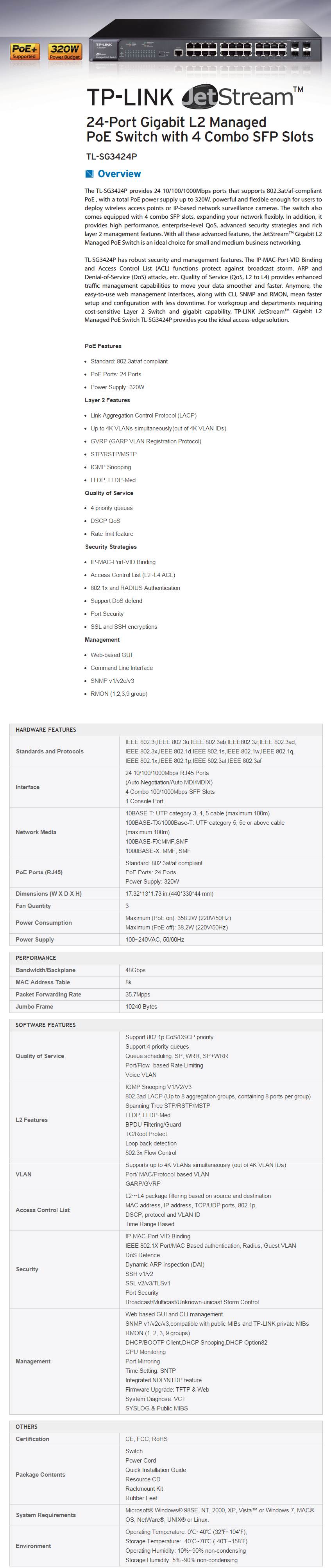 The TL-SG3424P provides 24 10/100/1000Mbps ports that supports 802.3at/af-compliant PoE , with a total PoE power supply up to 320W, powerful and flexible enough for users to deploy wireless access points or IP-based network surveillance cameras. The switch also comes equipped with 4 combo SFP slots, expanding your network flexibly. In addition, it provides high performance, enterprise-level QoS, advanced security strategies and rich layer 2 management features. With all these advanced features, the JetStreamTM Gigabit L2 Managed PoE Switch is an ideal choice for small and medium business networking.