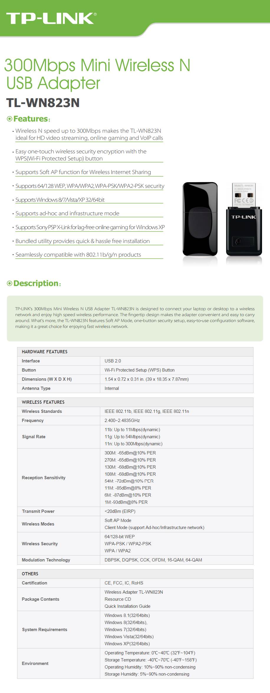 TP-LINK's 300Mbps Mini Wireless N USB Adapter TL-WN823N is designed to connect your laptop or desktop to a wireless network and enjoy high speed wireless performance. The fingertip design makes the adapter convenient and easy to carry around. What’s more, the TL-WN823N features SoftAP Mode, one-button security setup, easy-to-use configuration software, making it a great choice for enjoying fast wireless network.