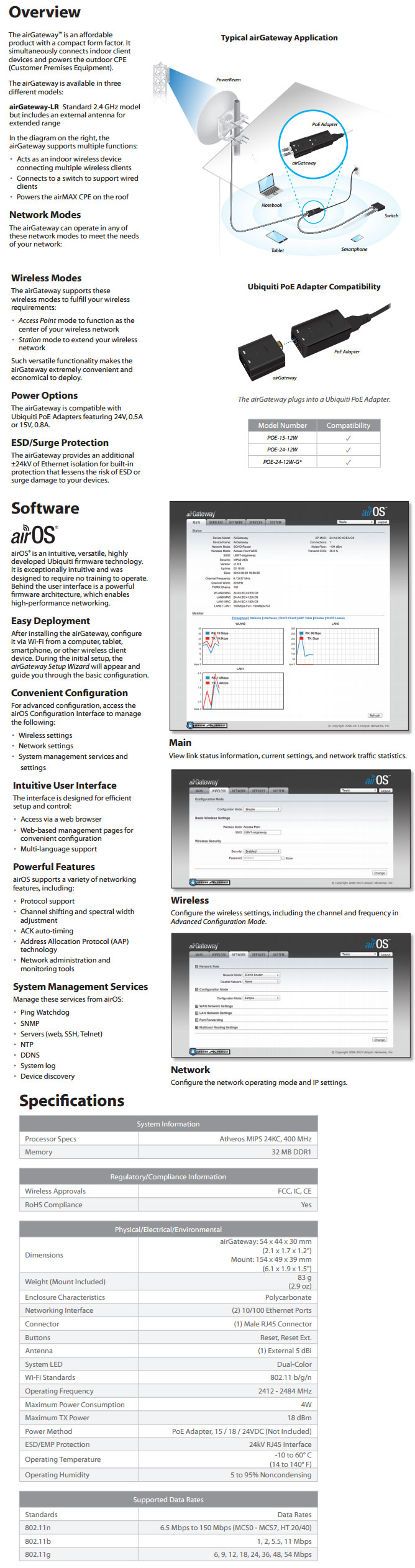 The airGatewayâ„¢ is an affordable product with a compact form factor. It simultaneously connects indoor client devices and powers the outdoor CPE (Customer Premises Equipment).