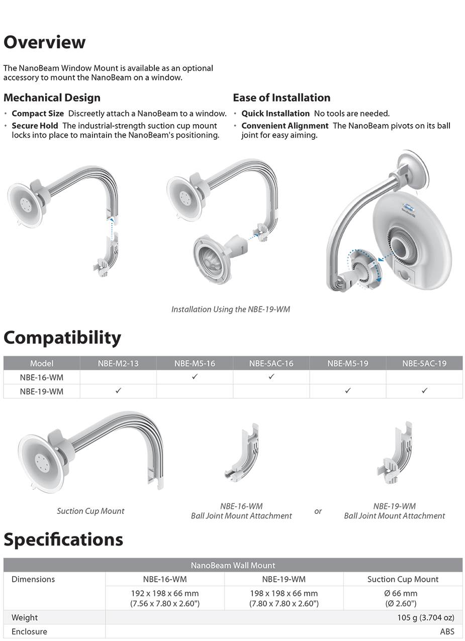Product Name | Ubiquiti Nanobeam Win Mount Nanobeam M5 19Dbi Window Mount (NBE-19-WM) |