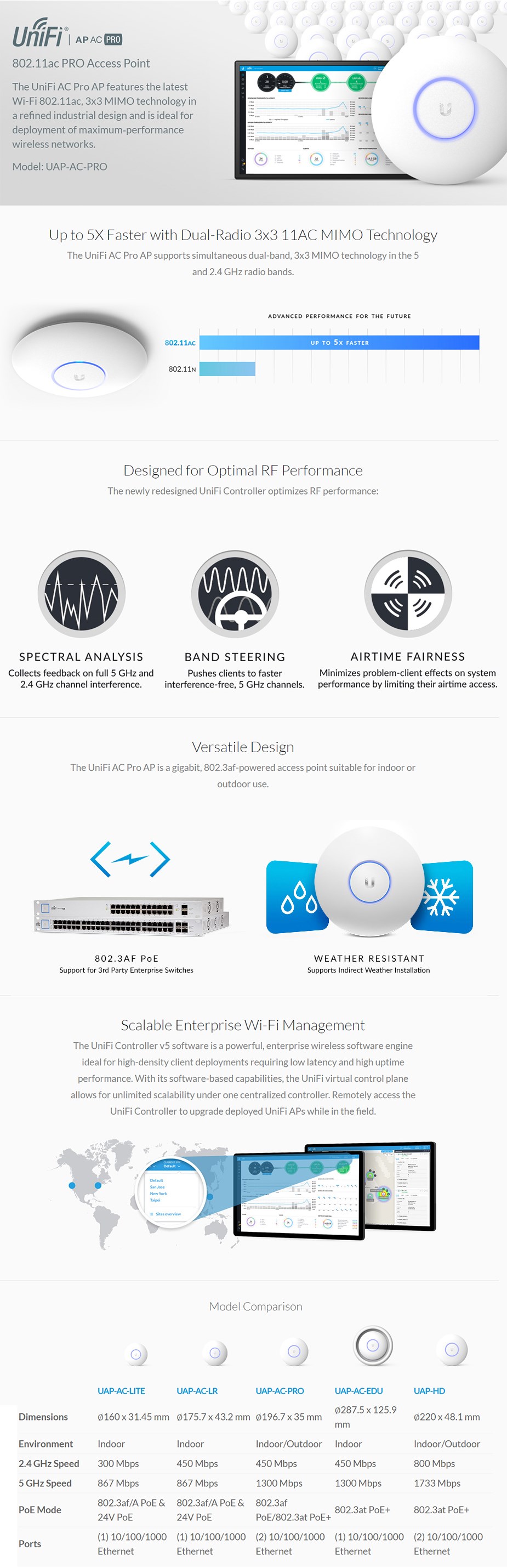 Ubiquiti Networks UAP-AC-PRO-V2 802.11ac Dual-Radio Access Point - 3x3 11AC MIMO Technology - 802.11 a/b/g/n/ac - 2x 10/100/1000 Ethernet Ports, 1x USB 2.0 Port - 3x Dual-Band Antennas, 2.4 GHz: 3 dBi, 5 GHz: 3 dBi - Unifi Switch (PoE) - 12 Months Limited Warranty (PoE- Included)