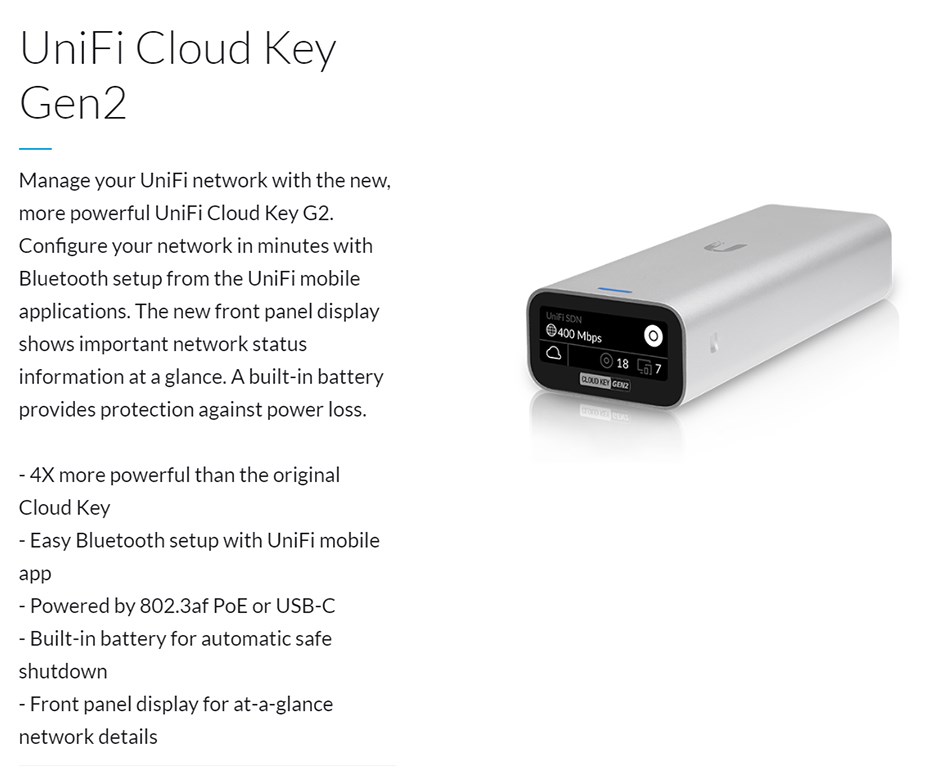 Ubiquiti Networks UCK-G2 Unifi Cloud Key Gen2 - Powered by 802.3af or QC 2.0 USB-C - Front Panel Display - Built-in Battery - 1x microSD Slot, 1x USB Type-C Power Port, 1x Ethernet Port - UCK-G2 - 12 Months Limited Warranty