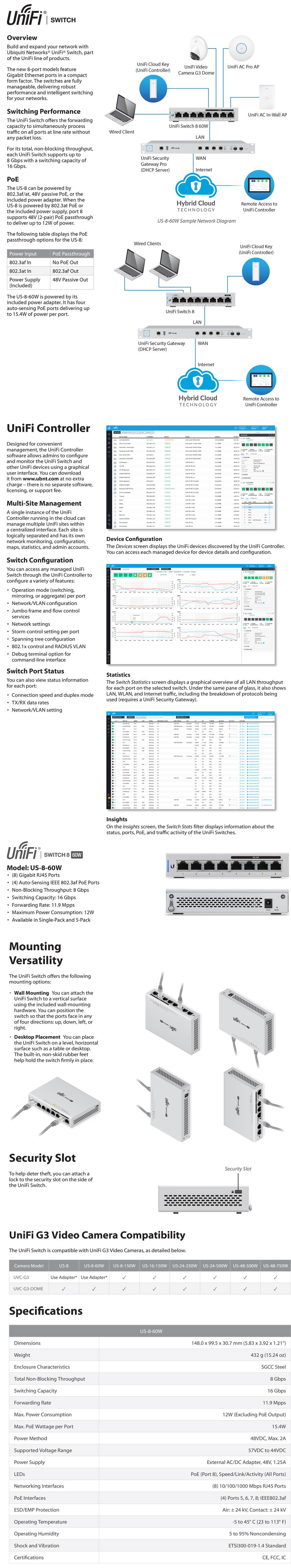 Ubiquiti Networks UBNT Unifi Switch 8-60W Managed 8-Port PoE+ Gigabit Switch - 8x Gigabit RJ45 Ports - 4x Auto-Sensing IEEE 802.3af PoE Ports - Non-Blocking Throughput: 8 Gbps - Switching Capacity: 16 Gbps - Forwarding Rate: 11.9 Mpps - Maximum Power Consumption: 12W - This unit must be powered with the included power supply and cannot be powered over 802.3at - 12 Months Limited Warranty - US-8-60W