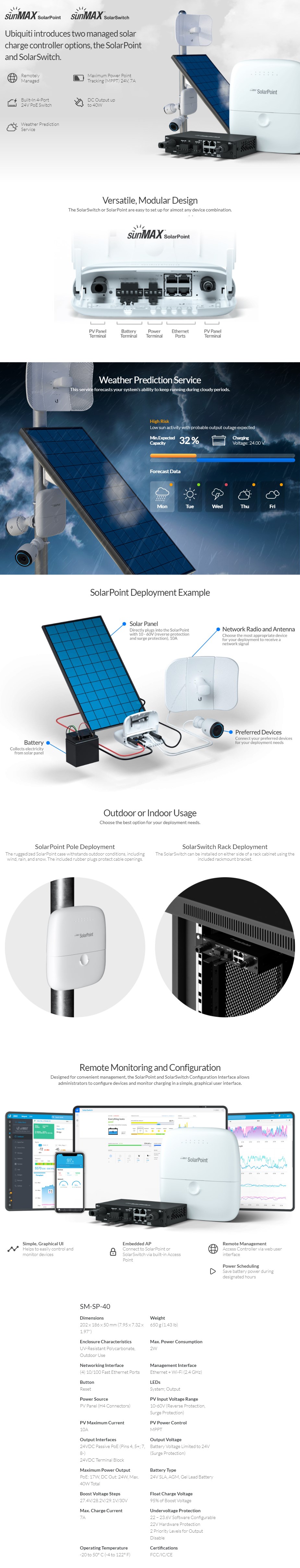 Ubiquiti SunMAX SolarPoint Managed Charge Controller - Outdoor - PV Panel Input 10 – 60V - 4-port 24V PoE output 10/100 switch - 24V DC-Out Terminal - Max output power 40W - External 24V Battery Charging up to 7Amps (supports SLA, AGL, AGM) - SM-SP-40 - 12 Months Limited Warranty