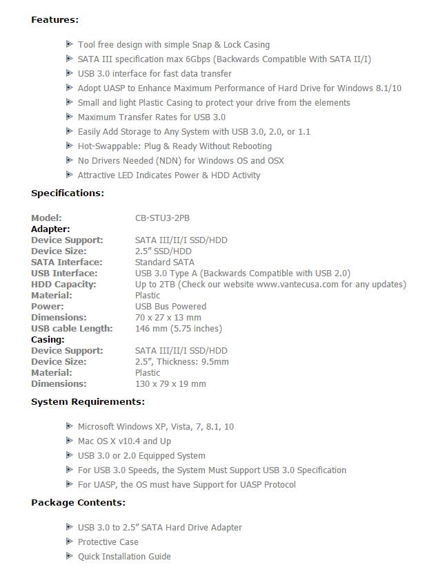 Manufacturer: Vantec. Introducing the USB 3.0 to 2.5 inch SATA Hard Drive Adapter with Case - a unique and simple adapter with a Casing that is pack with latest functionality. This light weight adapter with the Snap & Lock Casing without using any tools makes it so easy to connect any 2.5 inch SATA Hard Drive and link it to your USB 3.0 port. It is very fast using SuperSpeed USB 3.0 and UASP Protocol to move data around in high speed. This storage adapter works very well with your Ultra laptop or tablet for backing up your data or holding more data. The driver free design with plug and ready to play makes it even easier to connect to anything including system and appliances.